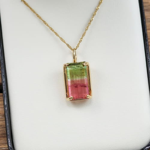 1.    A unique pendant featuring a 17.3 x 9.2mm watermelon tourmaline (8 ct. approximately) set in a 14k yellow gold solitaire style pendant.