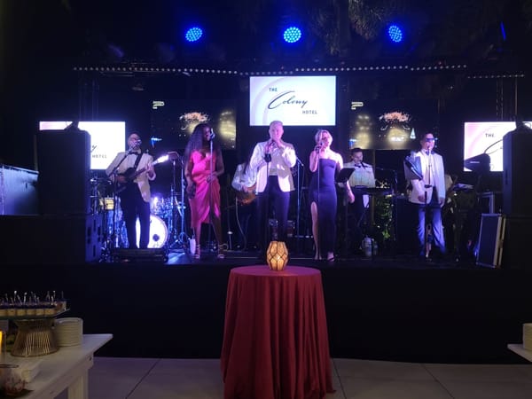 Photo on the left: Colony Hotel Owners Sarah Wetenhall, Andrew Wetenhall and guests